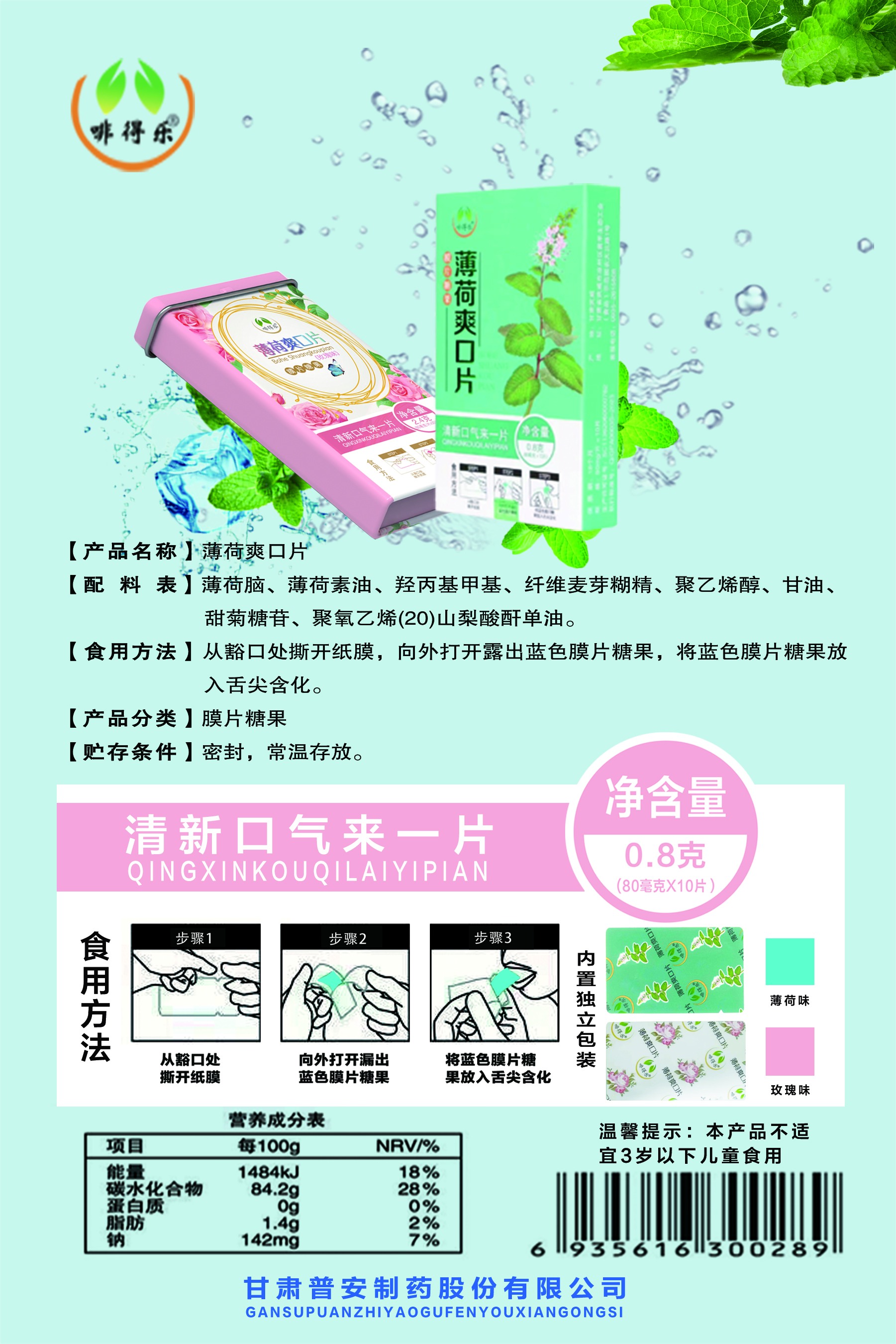 傳統(tǒng)的口香糖需要咀嚼食用,使用后有不可降解殘留物,易造成環(huán)境污染。薄荷爽口片是入口即化的新型膜片糖果,此含片適口性好,溶解速度快,散發(fā)獨(dú)特香氣,可提神醒腦、利咽潤(rùn)喉、清新口氣。