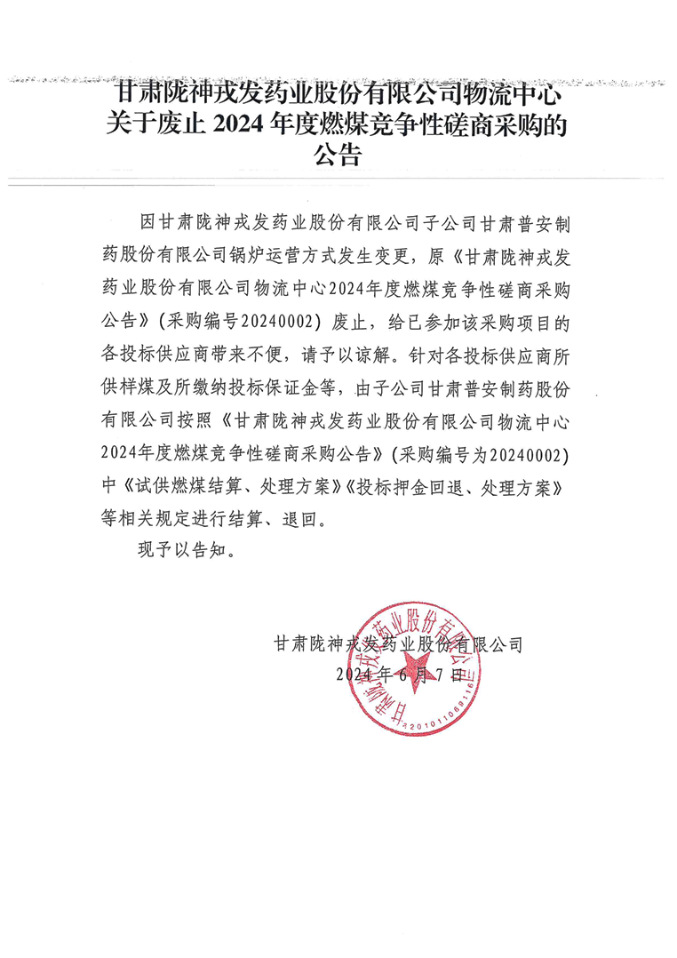 甘肅隴神戎發(fā)藥業(yè)股份有限公司物流中心關(guān)于廢止2024年度燃煤競爭性磋商采購的公告