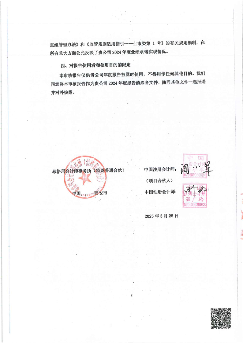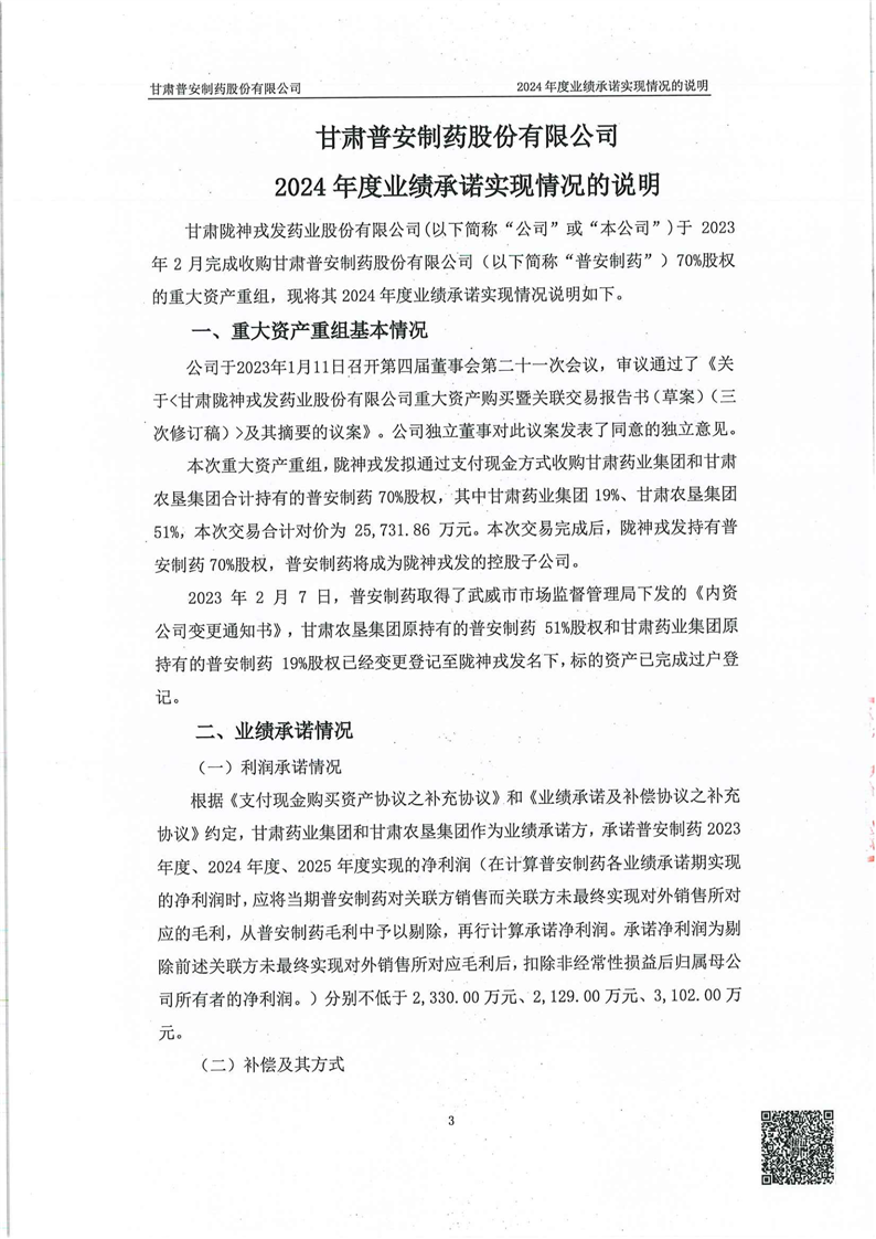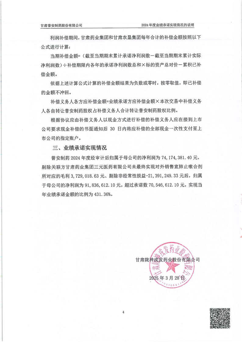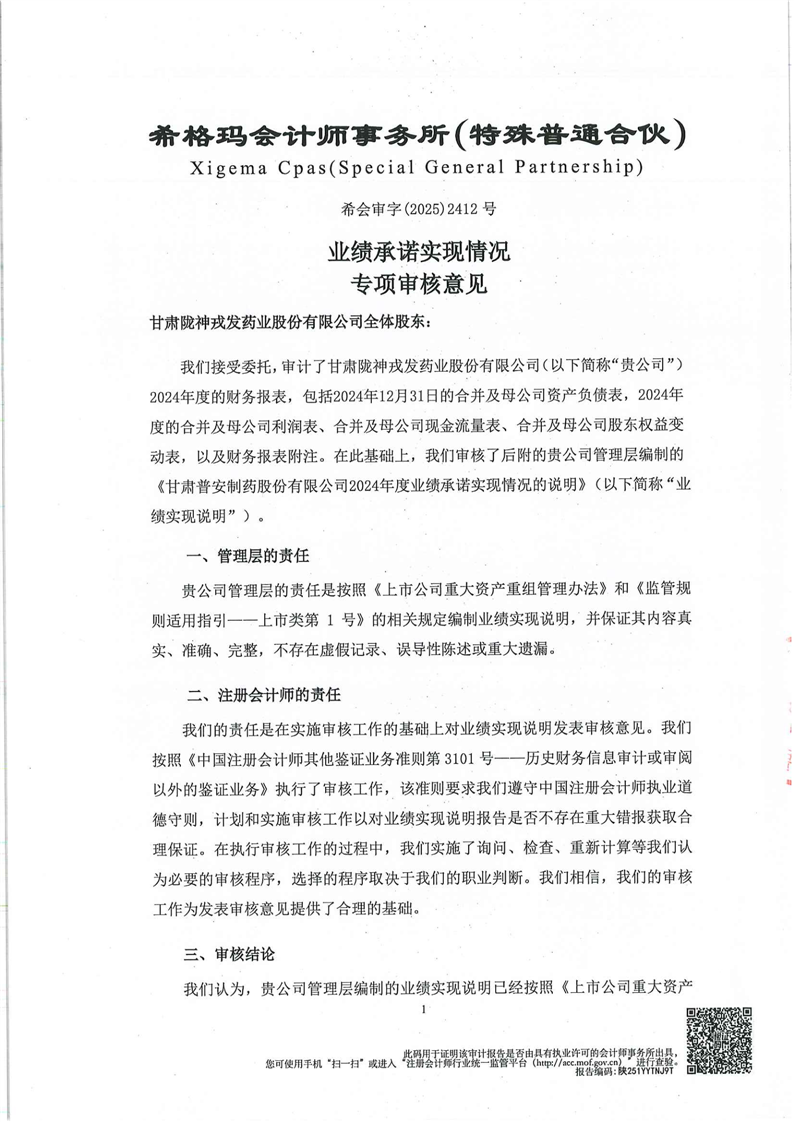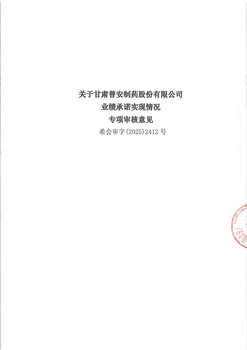 關于甘肅普安制藥股份有限公司業(yè)績承諾實現(xiàn)情況專項審核意見