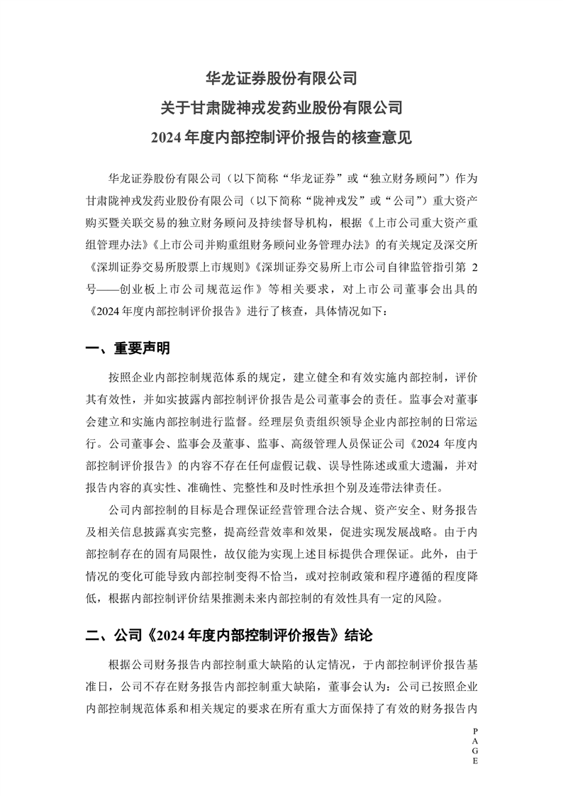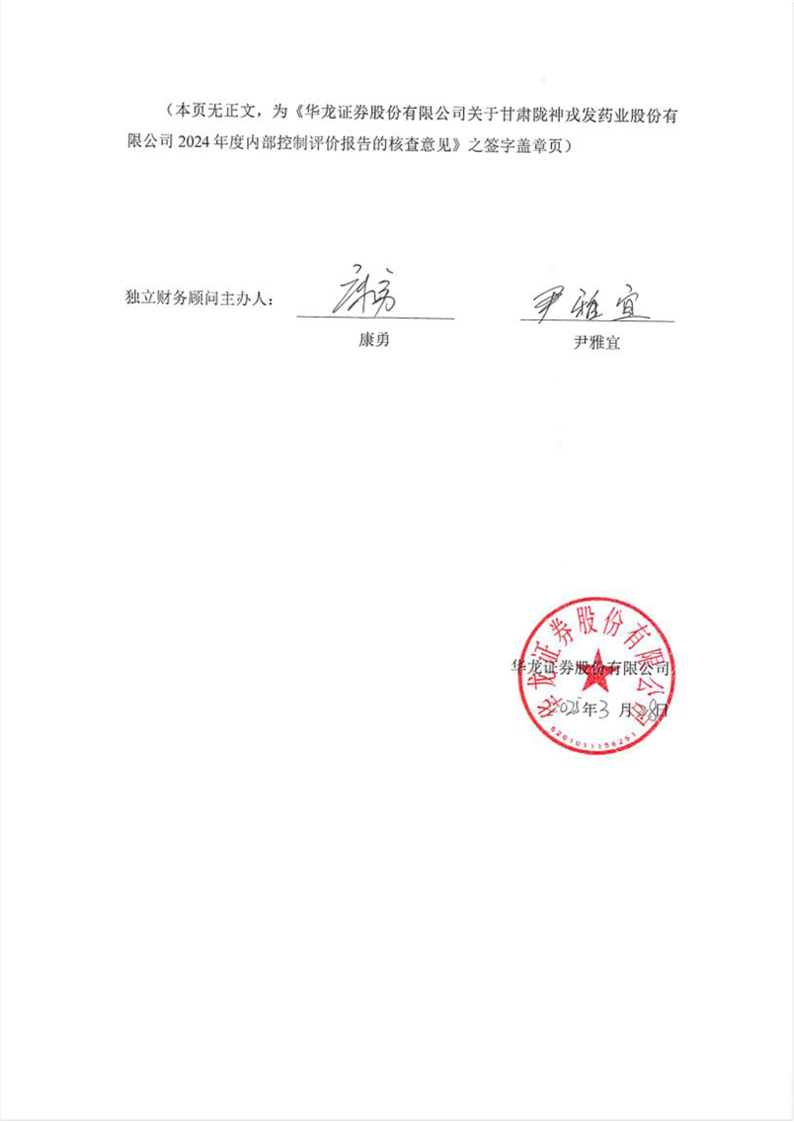 華龍證券股份有限公司關(guān)于甘肅隴神戎發(fā)藥業(yè)股份有限公司2024年度內(nèi)部控制評(píng)價(jià)報(bào)告的核查意見