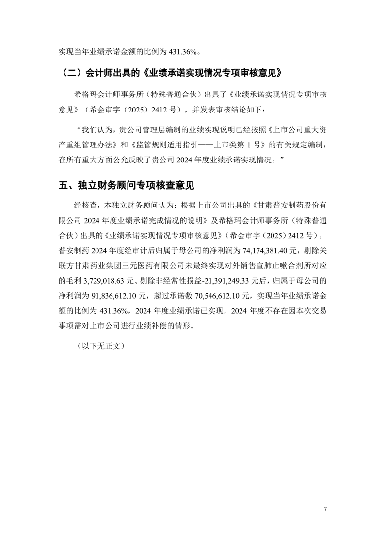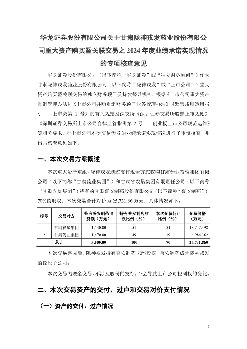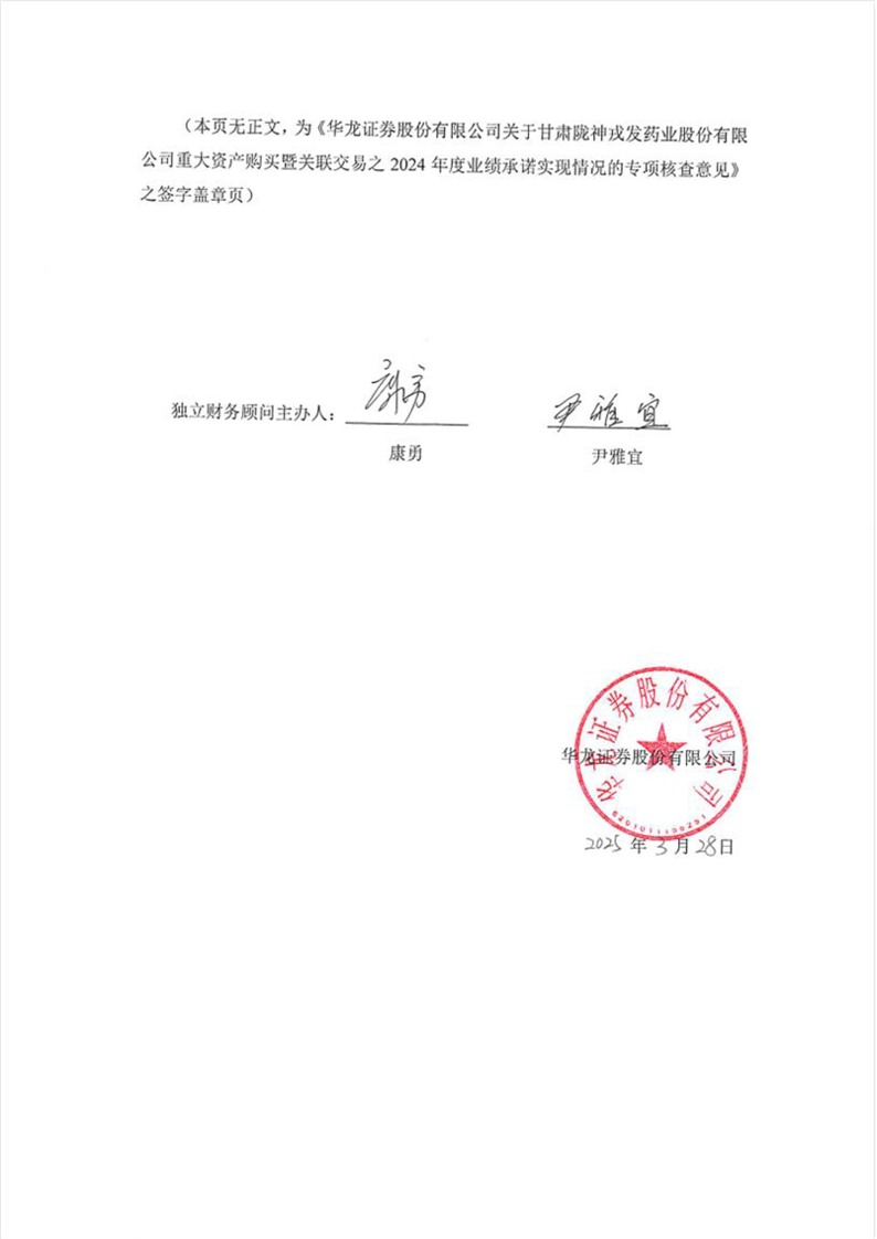 華龍證券股份有限公司關(guān)于甘肅隴神戎發(fā)藥業(yè)股份有限公司重大資產(chǎn)購買暨關(guān)聯(lián)交易之2024年度業(yè)績承諾實(shí)現(xiàn)情況的專項(xiàng)核查意見