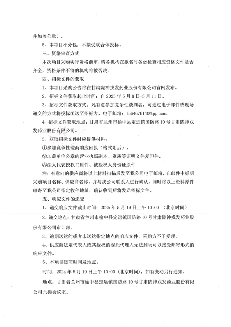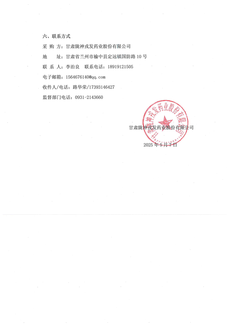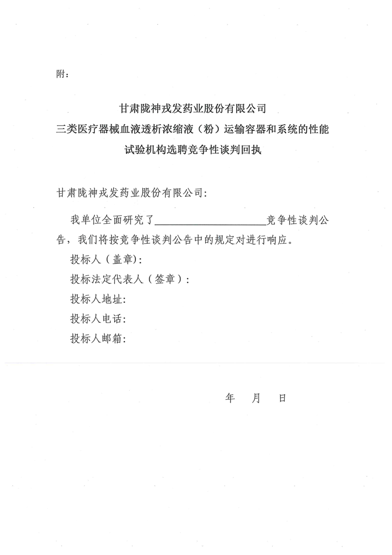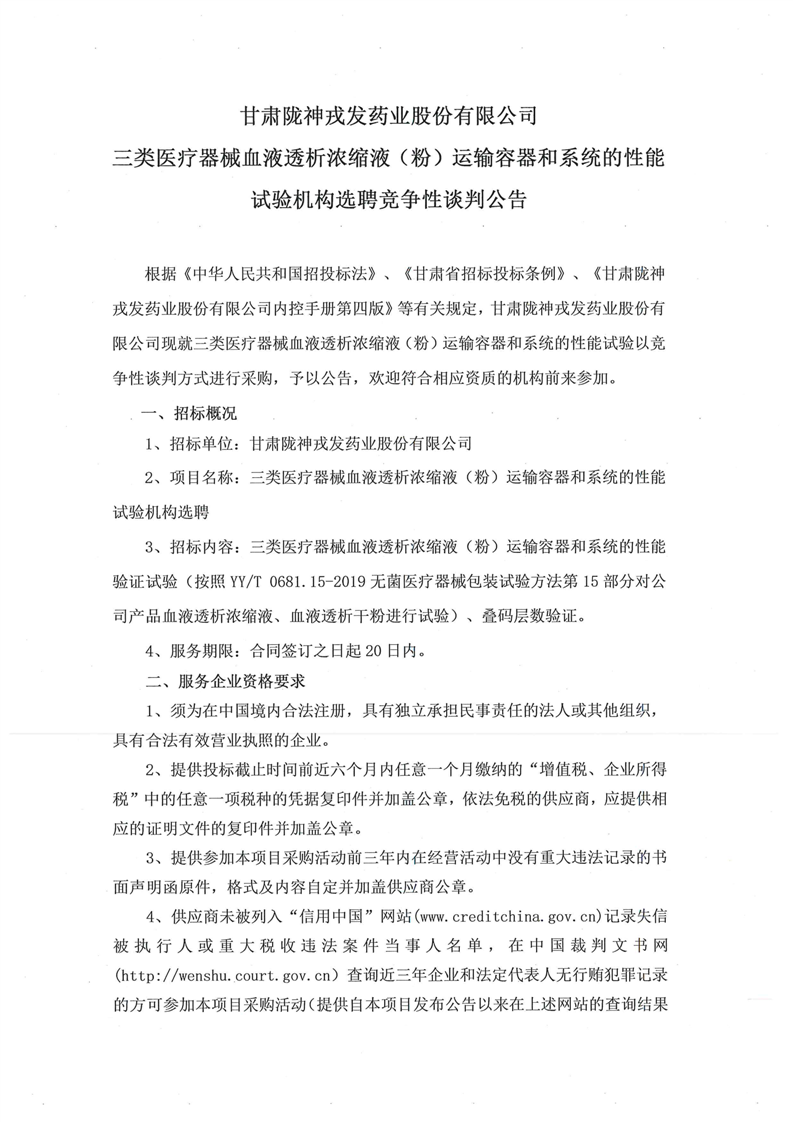 甘肅隴神戎發(fā)藥業(yè)股份有限公司三類醫(yī)療器械血液透析濃縮液(粉)運輸容器和系統(tǒng)的性能試驗機構(gòu)選聘競爭性談判公告