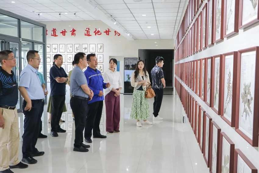 調(diào)研組一行首先在制劑車間大廳參觀了公司精心制作的中藥材標(biāo)本展示墻,直觀體驗(yàn)近40年厚重的中醫(yī)藥文明“活化石”,對(duì)甘肅省豐富的中藥材資源表現(xiàn)出了濃厚的興趣。