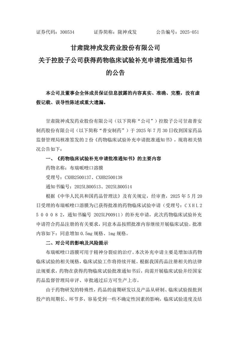 關(guān)于控股子公司獲得藥物臨床試驗補充申請批準通知書的公告